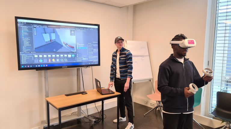 Voor deze studenten van de afdeling Zorg en IT werd een kennismaking georganiseerd, als aftrap van hun project. De presentatie en uitleg werd verzorgd door onze VR studenten Jari en Lukas, die hun stage afgelopen vrijdag succesvol hebben afgerond. Zij presenteerden hun eindproduct; een VR toepassing waarin diverse blusmiddelen en technieken geoefend kunnen worden. Daarnaast lieten ze de studenten ook vooral zelf ervaren.